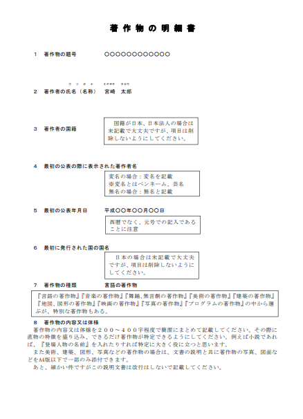 文化庁のHPから『著作権登録の手引き』と『申請様式』をDLしてもらったら、今回の実名登録の場合なので『1ページ』『4ページ』を使用してもらうことになる。
