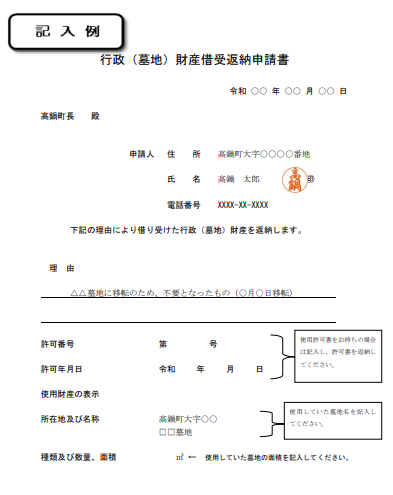 【行政(墓地)財産借受返納申請書記入例】