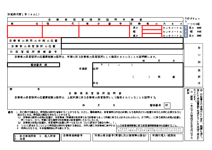 さて、早速、『自動車保管場所証明書』『保管場所標章交付申請書』の書き方を説明したいと思います。まぁ、『用意するもの』でも述べましたが、書く内容は全く一緒なので一枚の書き方を説明すれば問題ないです。