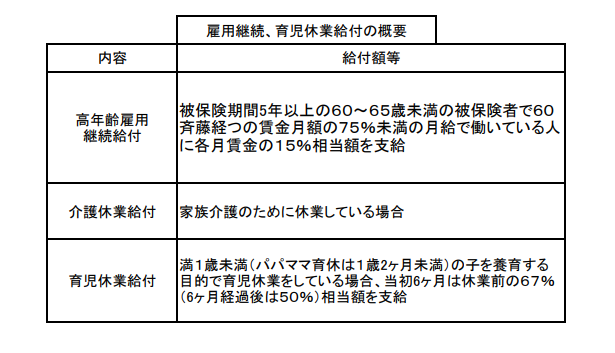 高齢者や介護、育児などで離職せざるを得ない事例があるとしよう、この時は雇用継続を促すために雇用継続給付、育児休業給付がある。