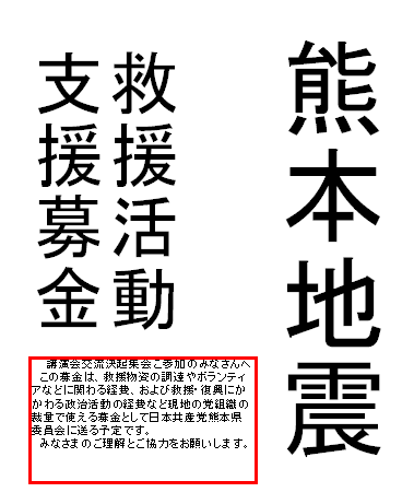 これはネットの写真を参考に作ったのだが、これをもって街頭で寄付を行っていたら誰でも熊本地震で被災した人達のために贈る募金であると思うだろう。