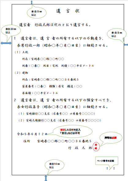 保管申請制度を利用しようがしまいが、あくまで自筆証書遺言書である以上、遺言書の書き方の注意事項は、基本『変わらない』のであるが、この保管申請制度の場合は四方に一定のスペースを確保しなければならないことである。